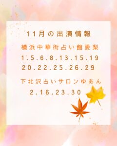 2025年10月2日 / 最終更新日時 : 2025年10月2日 admin@moekamahalo.com 10月の出演情報 10月の出演情報 🎃横浜中華街占い館愛梨 11-19時 🎃下北沢占いサロンゆあん 日曜13-20時 ✳️その他個人鑑定,講座 LINE、zoomセッション随時受付中です